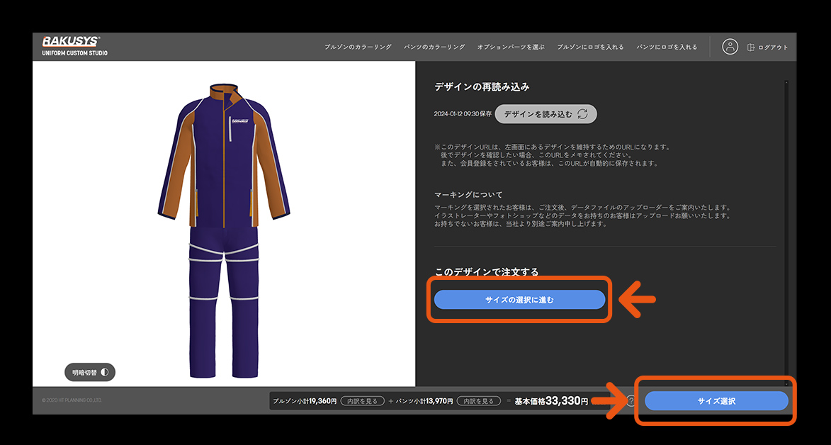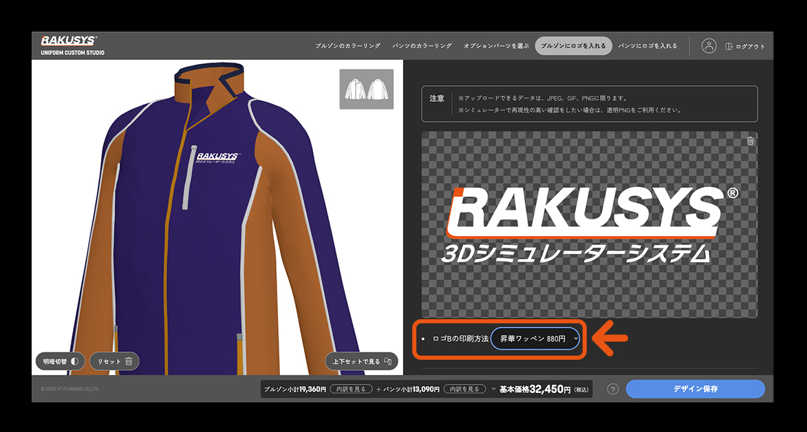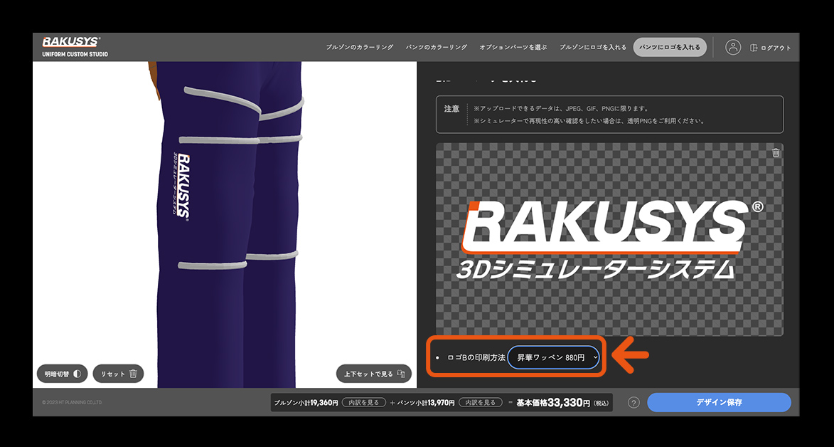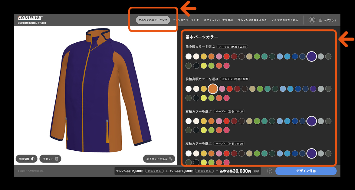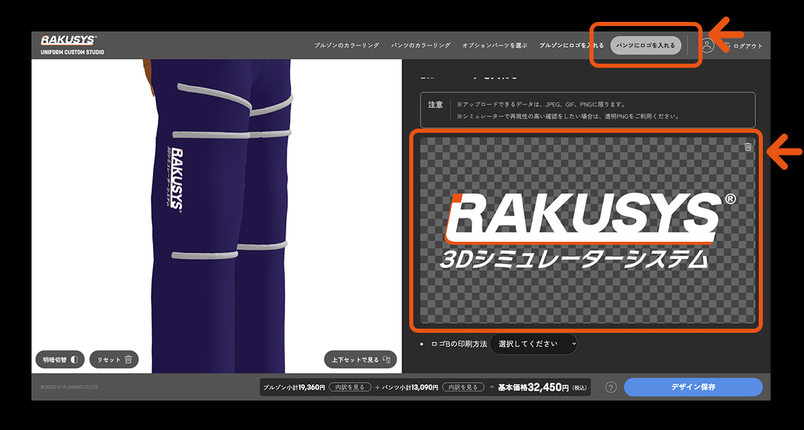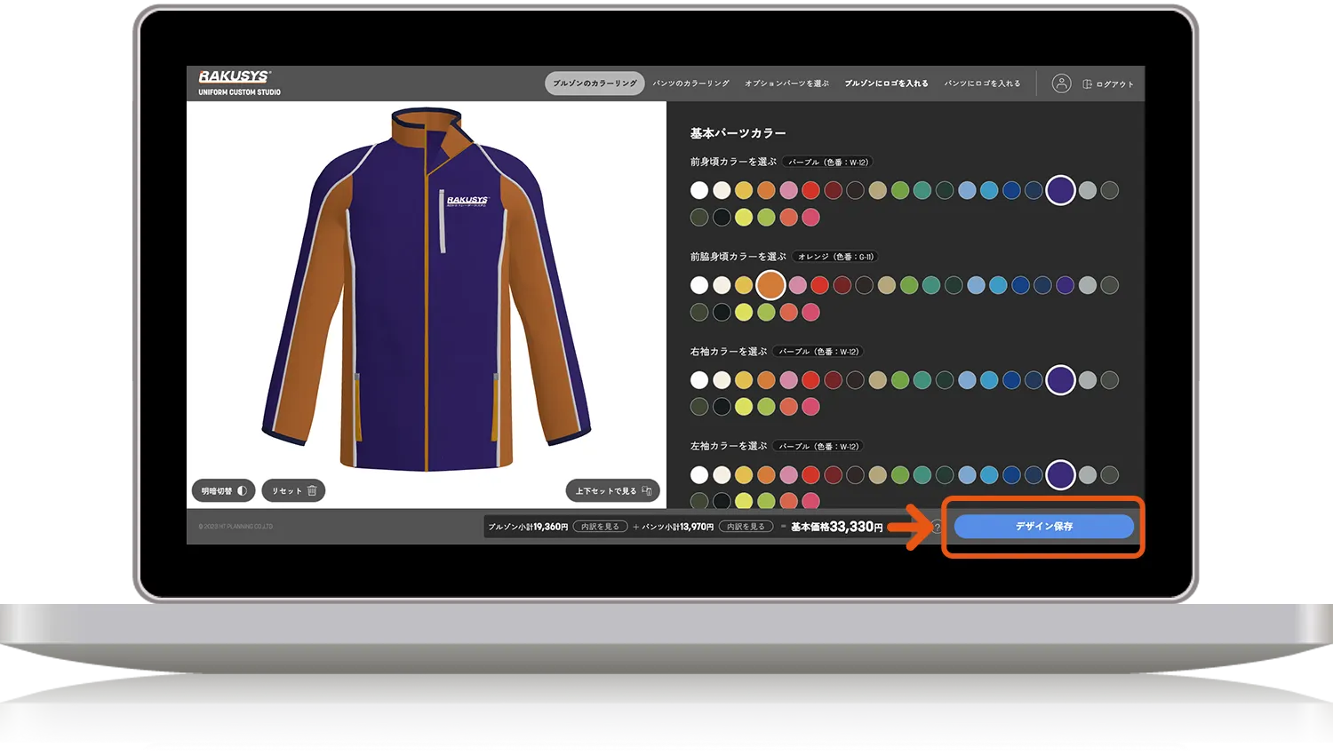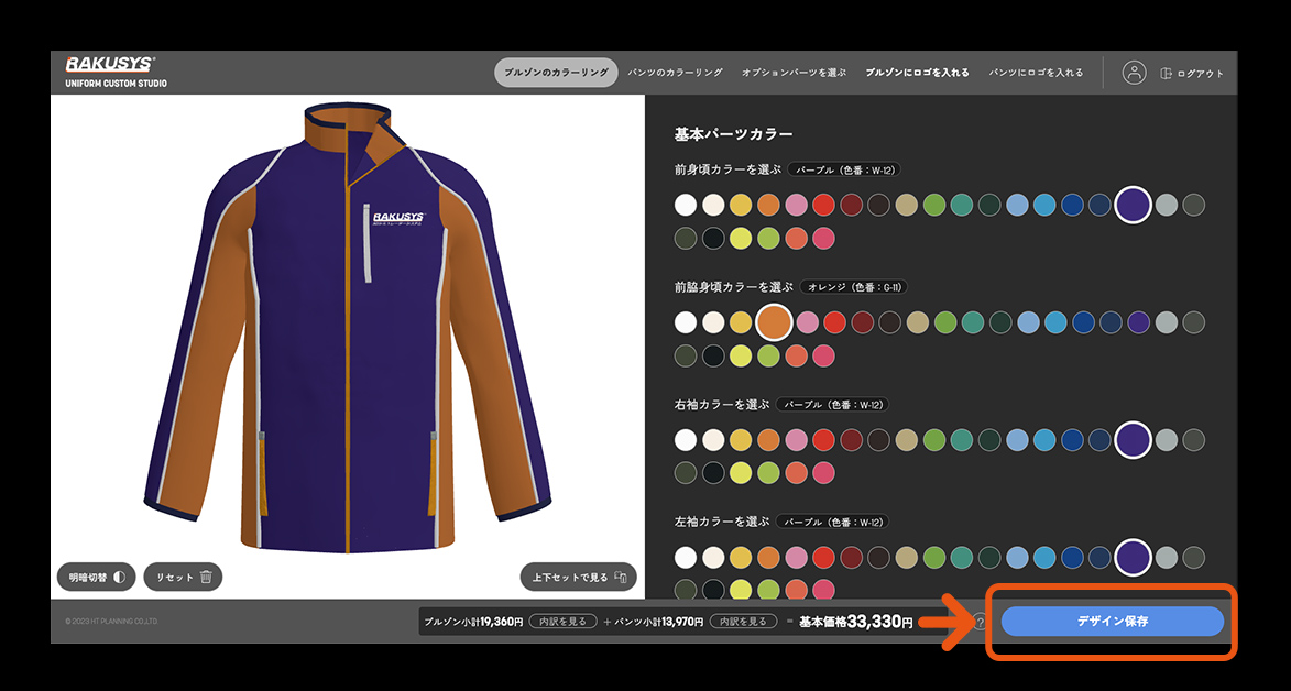 全てのカラーリングとマーキングのアップロードが完了したら、一番下の【デザイン保存】をクリック