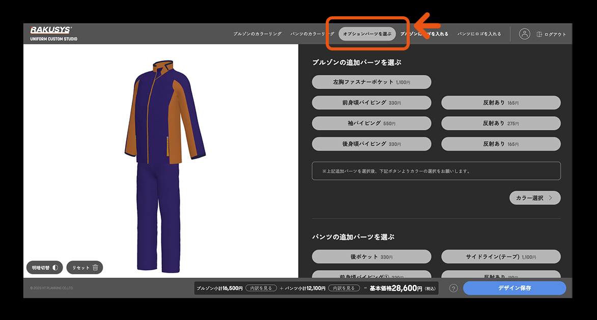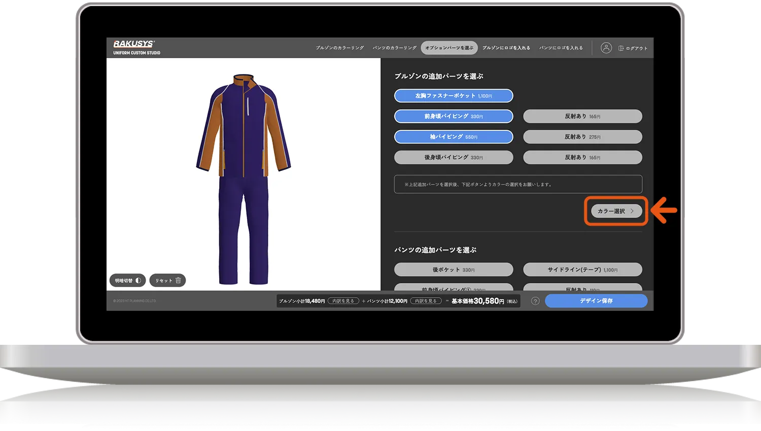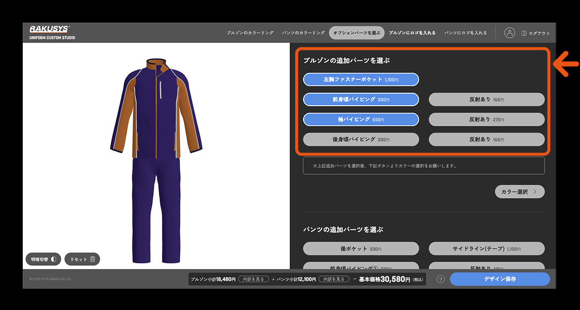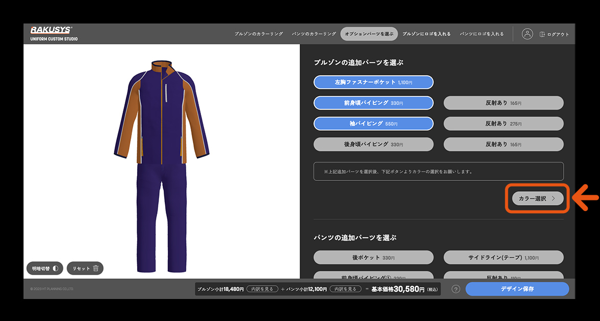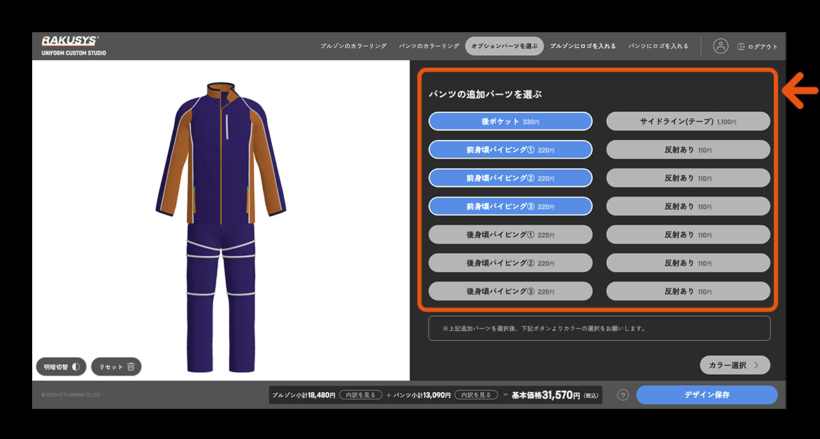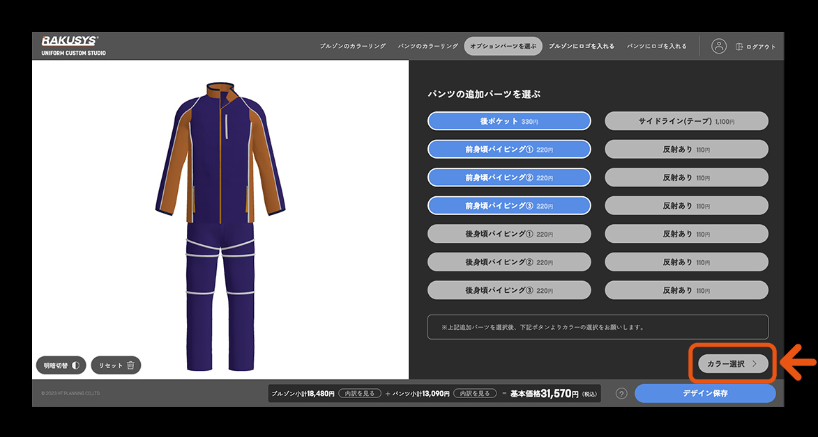 ・ブルゾン、パンツをセットでご購入いただく際は、3D画面右下の「上下セットで見るボタンをクリックしていただくと、上下セットでご確認いただけます。