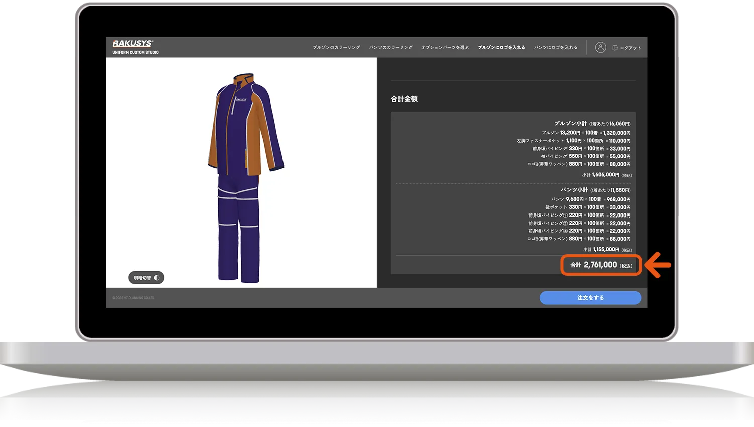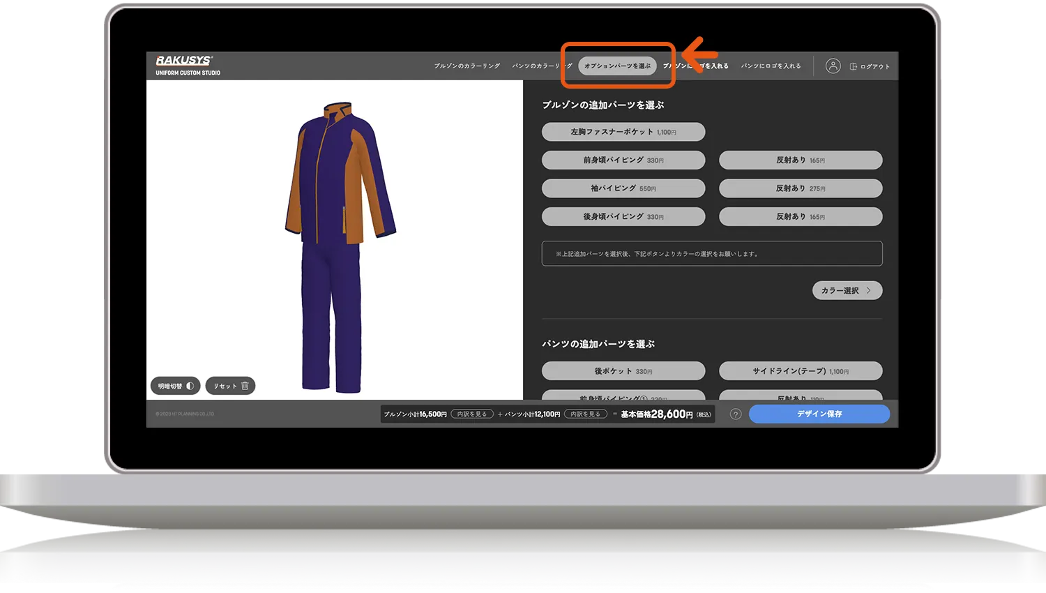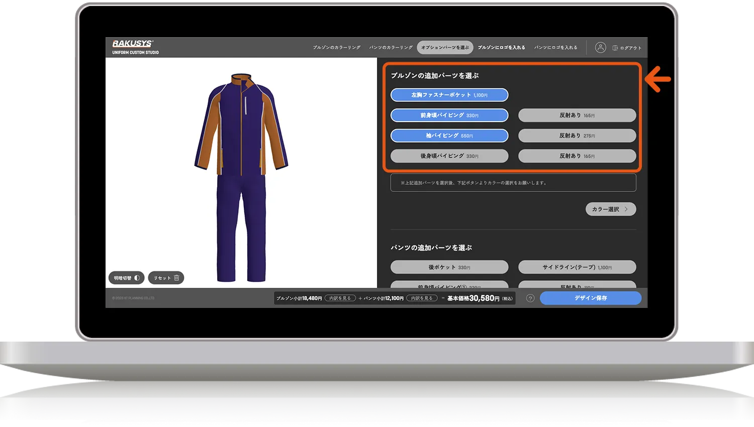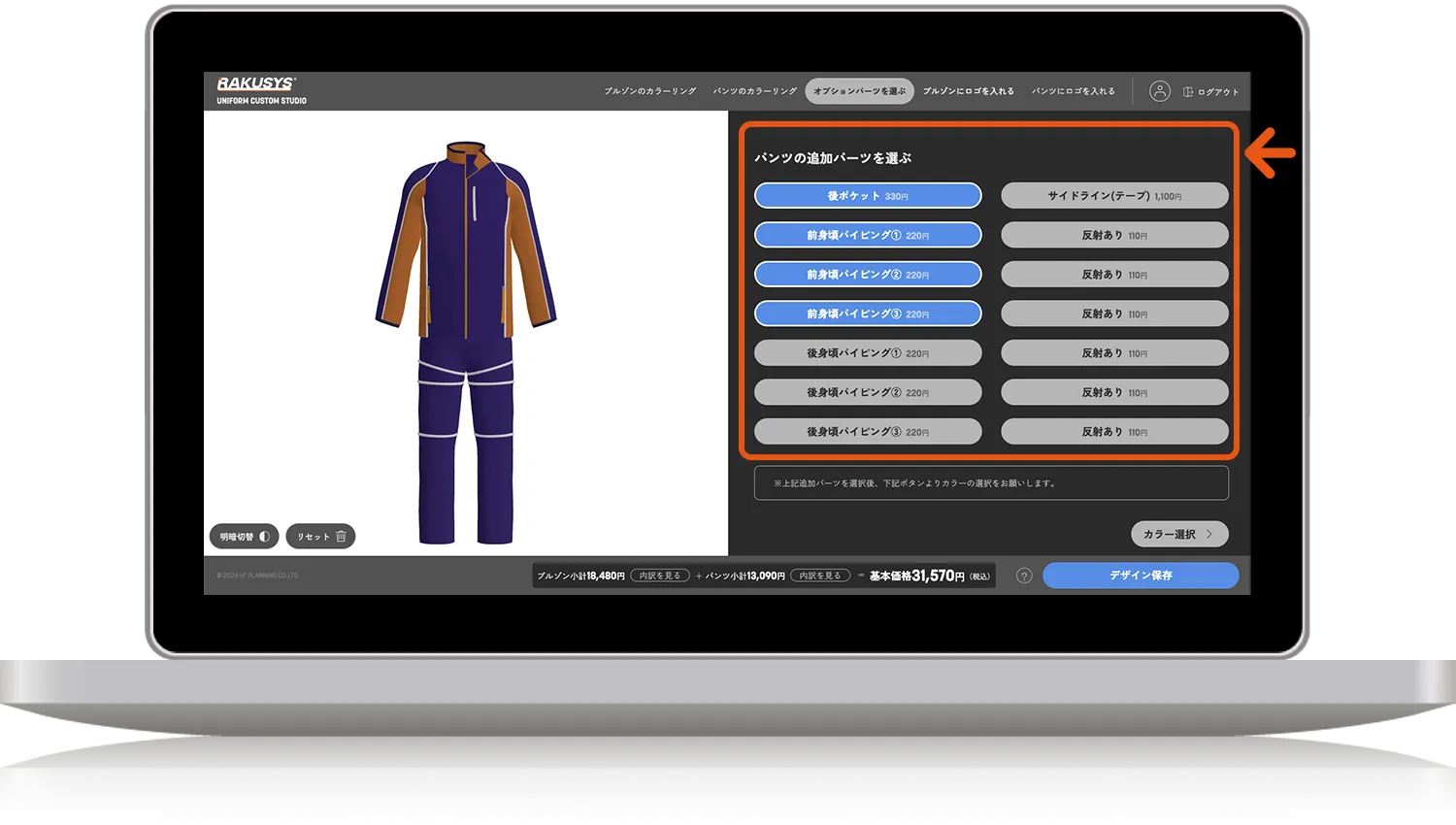 ・ブルゾン、パンツをセットでご購入いただく際は、3D画面右下の「上下セットで見るボタンをクリックしていただくと、上下セットでご確認いただけます。