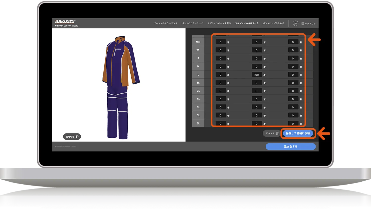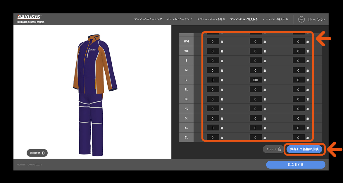 ブルゾンの必要枚数を入力→「保存して価格に反映」をクリック