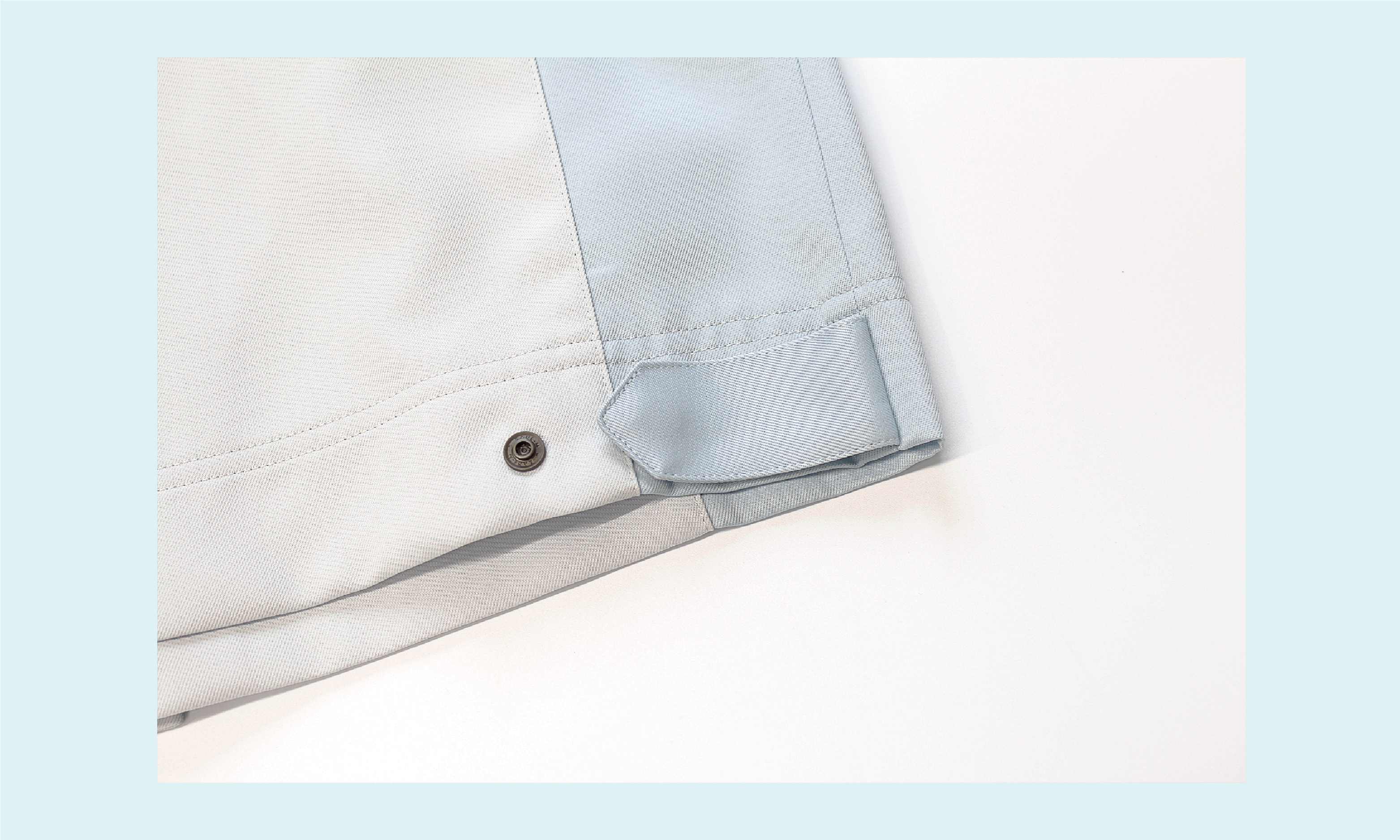 尾錠ベルトが裾部分についていて着る人の腰回りをしっかりとホールドし、ワークウェアに適した仕様となっております。