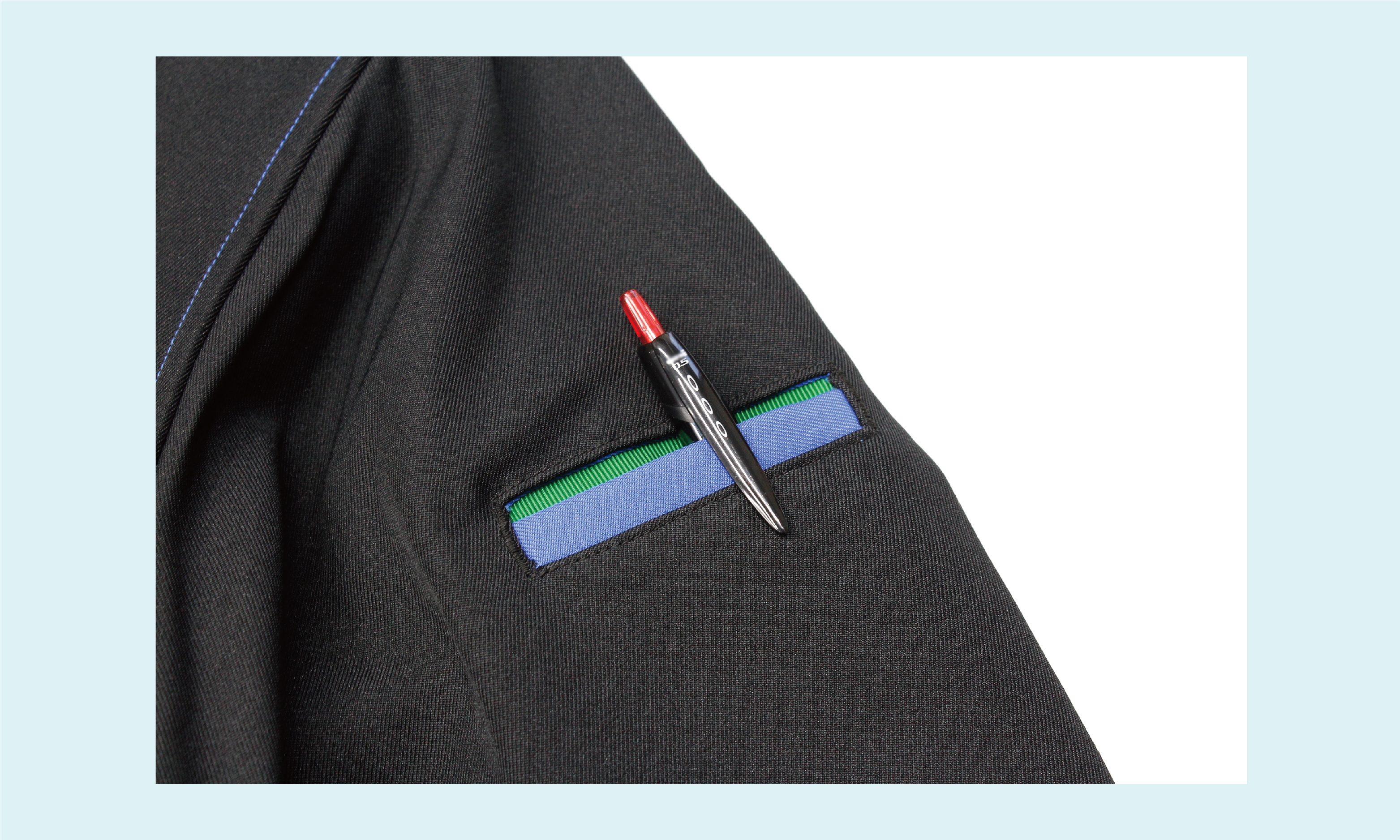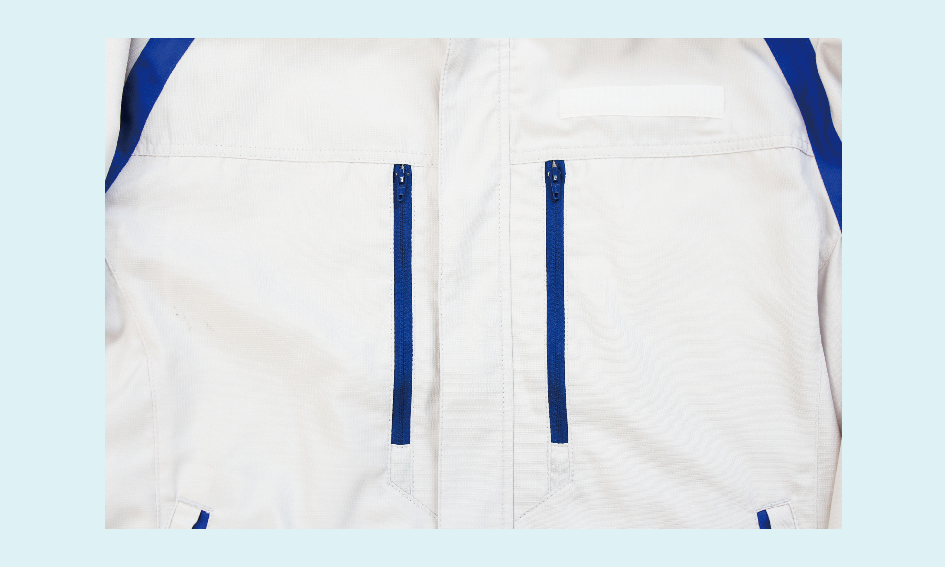 両胸ファスナーポケット・腰ポケット・尾錠ベルト・セットインスリーブ・ペン差し